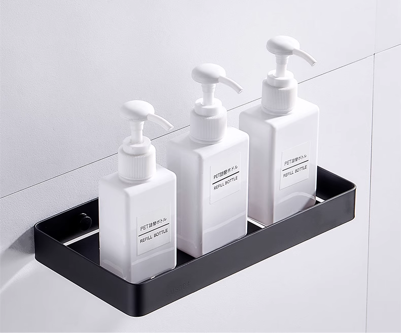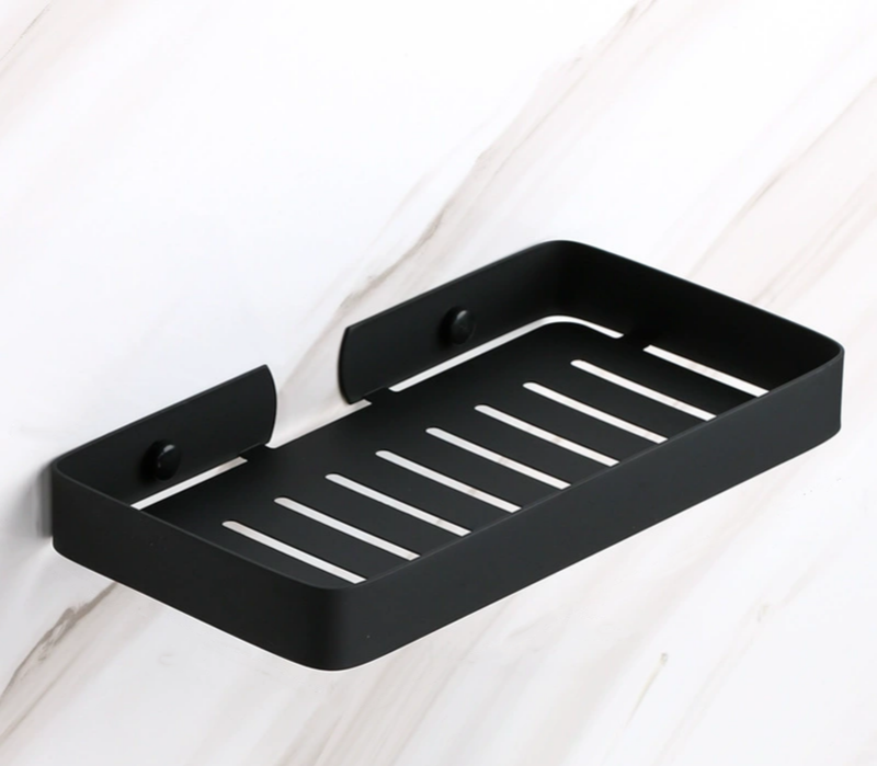 Denna hylla är utformad för att hålla ordning på tvål,  och andra badrumsprodukter. Med sin integrerade krok undertill kan du enkelt hänga upp en handduk eller tvättlapp för snabb åtkomst. Hyllan är tillverkad av slitstark plast och aluminium, vilket gör den tålig mot fukt och enkel att rengöra.